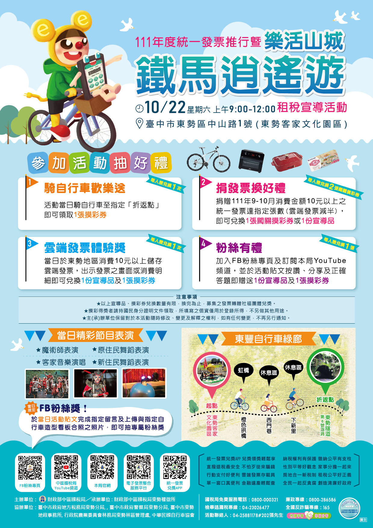 好消息!111年度統一發票推行暨「樂活山城 鐵馬逍遙遊」租稅宣導活動將於10月22日星期六上午在東勢客家文化園