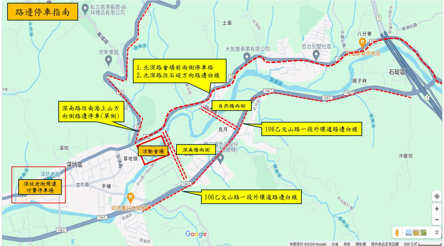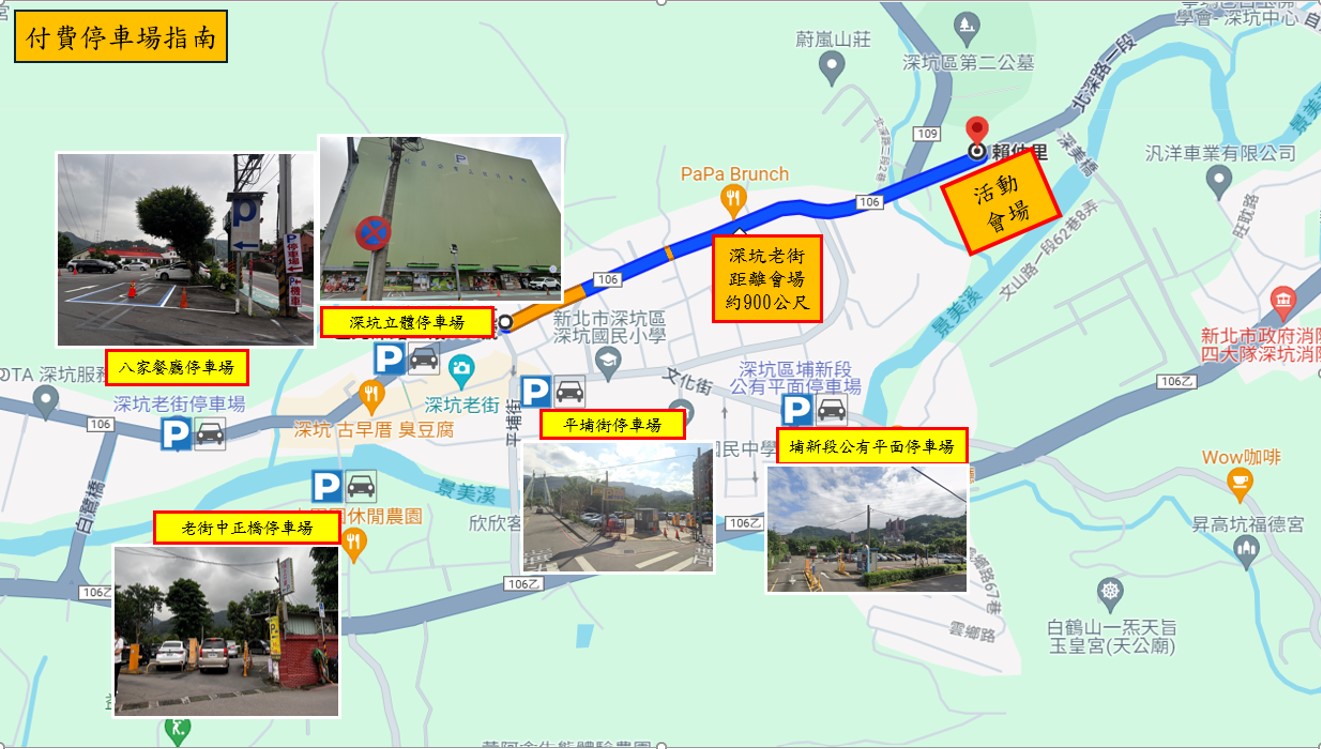活動主會場鄰近深坑老街(距離會場約900公尺不等),建議可停於付費停車場,以下提供周邊付費停車場資訊供參考。