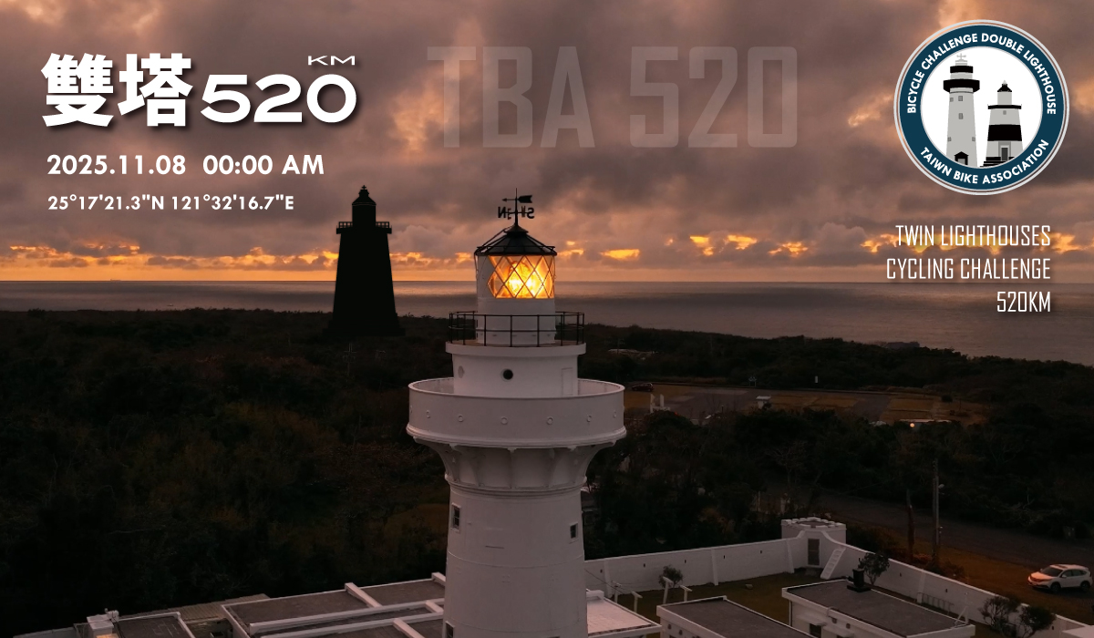 | | | 2025-11-08 | 雙塔520 | | 里程數 | 520 KM | | 集合地點 | 新北市石門區 富貴角 - 楓林橋 | | 出發時間 | 2025年11月 8日 00:00~00:30 | | 關門時間 | 11月09日 06:00 | | 合格時間 | 30 Hrs | | 計時方式 | RFID超高頻晶片計時 | | 報名費 | 2,600元 / 114年1月5日24:00前報名享早鳥優惠價2,200元 | | 報名資格 | 年滿18歲 | | 報名日期 | 民國113年12月5日 12:00起至民國114年7月31日24:00止 | | 早鳥報名 | 114年1月5日24:00前報名享早鳥優惠2,200元 | | 宅配之物資 | 晶片帽貼、坐管貼、帽尾帶、紀念衫、單車襪及加購品 | | 完成認證獎勵 | 雙塔獎座、精美認證書、運動毛巾、終點點心 | |